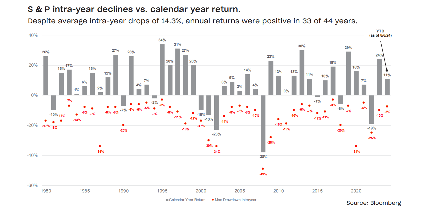Over the last few weeks, we have had a sizable drawdown in global equity markets. While the speed and size of such drawdowns can create uneasiness for investors, it is important not to let emotions drive investment decisions when such events occur. Maintaining a long-term focus and staying invested has delivered strong compounding returns to investors. Investors who have remained invested from the start of the Global Financial Crisis in August 2007 through to August 6, 2024, have enjoyed 8.4% annualized total returns from the broad equity market. Remember this period also includes the equity market sell-off that occurred during the global pandemic as well as the recent heightened inflationary environment and central bank tightening cycle. Maintaining a long-term perspective in investing and not allowing decisions to be driven by emotional reactions to market movements is a sound investment strategy.